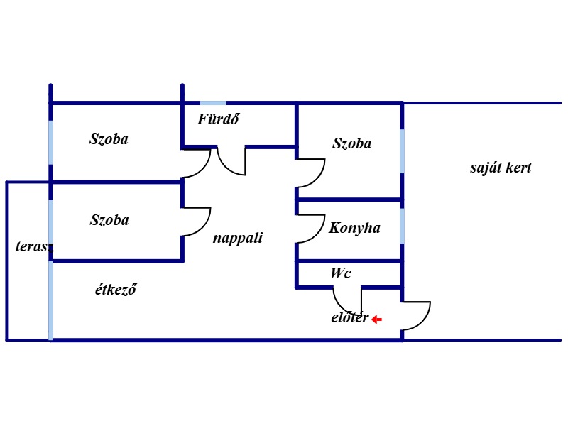Helyiségei: 3 szoba , nappali étkező, konyha, fürdőszoba,wc, előtér, terasz, 50 m2 saját használatú telekrész.